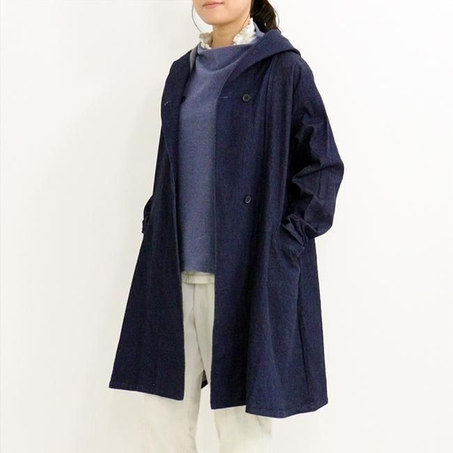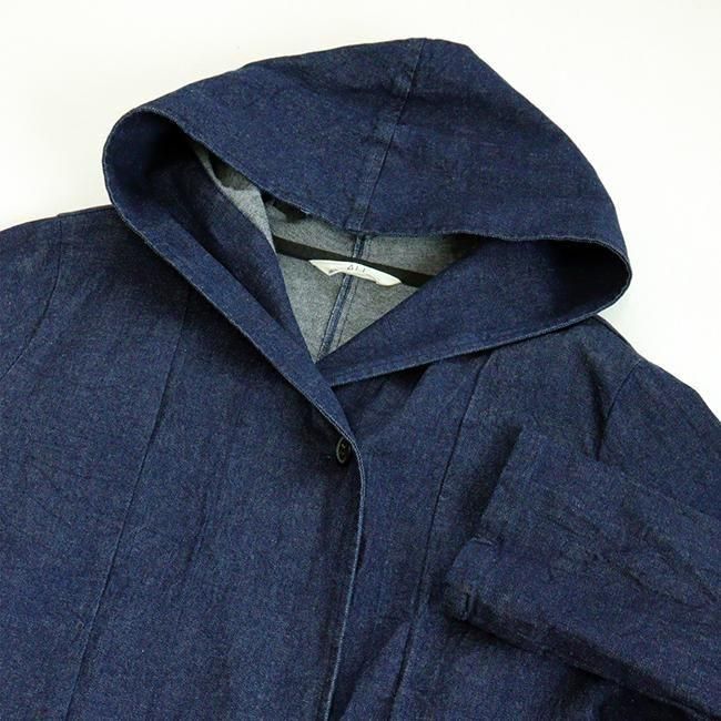 フードで首もともあたたかい、軽い着心地のデニムコート。