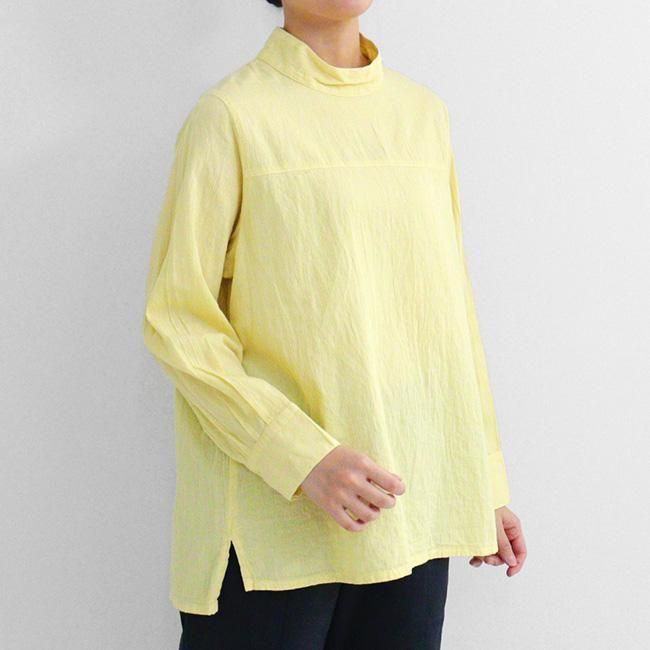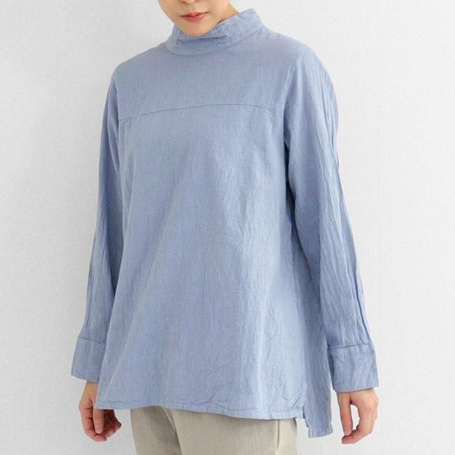 高めのスタンドカラーがコーディネートしやすい織柄後染めシャツ。