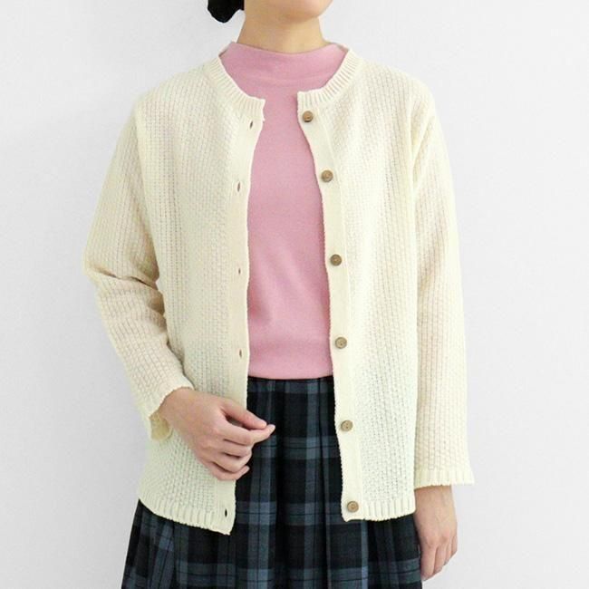 編み柄がかわいらしいカーディガンはウール100%であたたか。